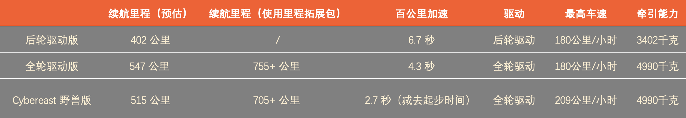 依据官网信息,Cybertruck共分为后轮驱动、全轮驱动、Cybereast 野兽版三个版别,对应分百公里加快时刻分别为6.7秒、4.3秒以及2.7秒(减去起步时刻)。